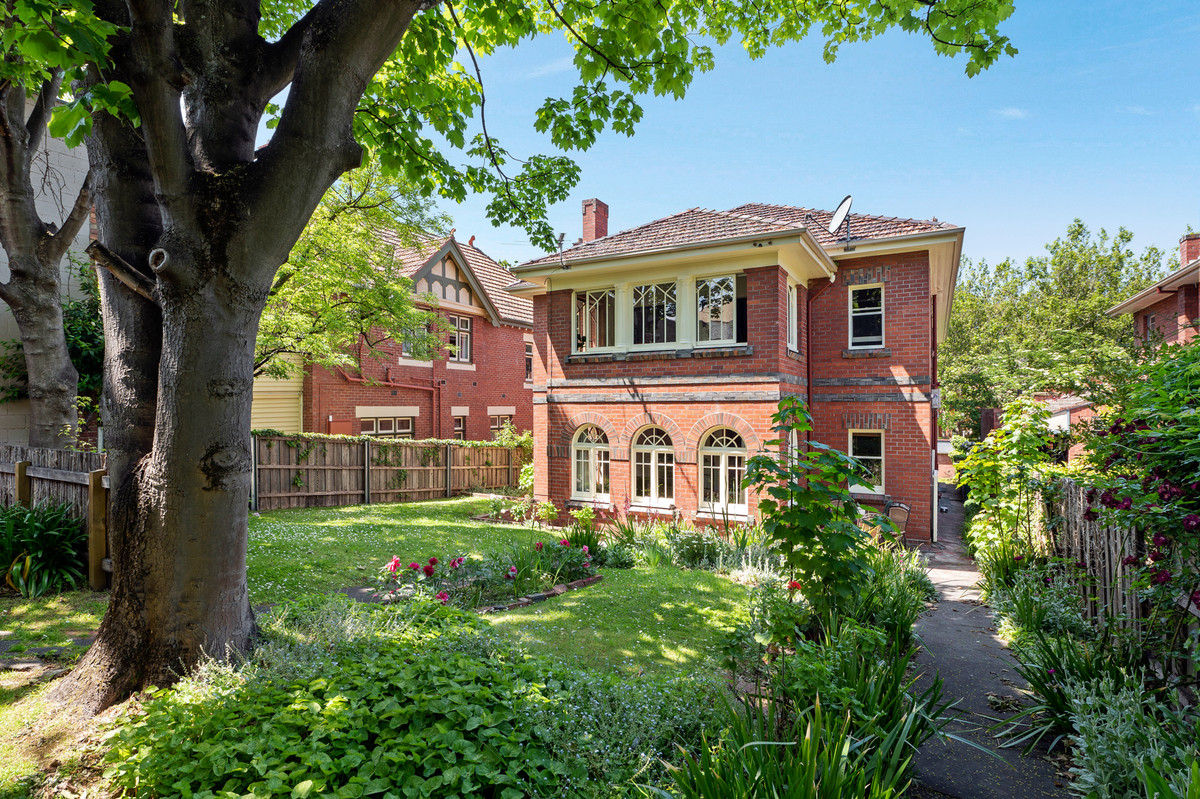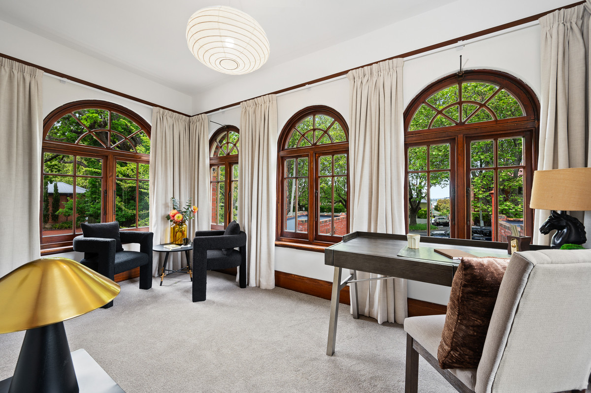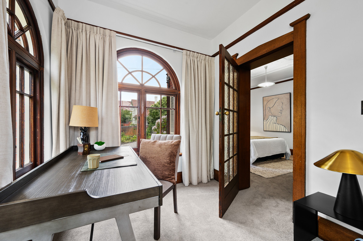 With classic original features throughout, the home showcases high ceilings, stunning ceiling roses, picture rails, timber framing, and a brick mantlepiece in the main living space. The front sunroom, framed by stunning timber arch windows, captures a beautiful outlook across the leafy streetscape with glimpses of the water and casino beyond.