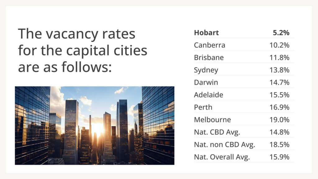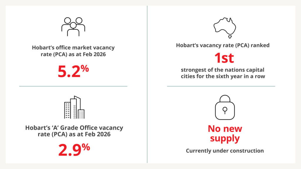 Hobart continues to deliver the strongest capital city office market performance in Australia, leading the country for the sixth consecutive year. According to the Property Council of Australia’s Office Market Report (February 2026), Hobart’s vacancy rate sits at just 5.2%, up slightly from 3.6% last year yet still materially tighter than every other capital city market and well below the national average of 15.9%.
